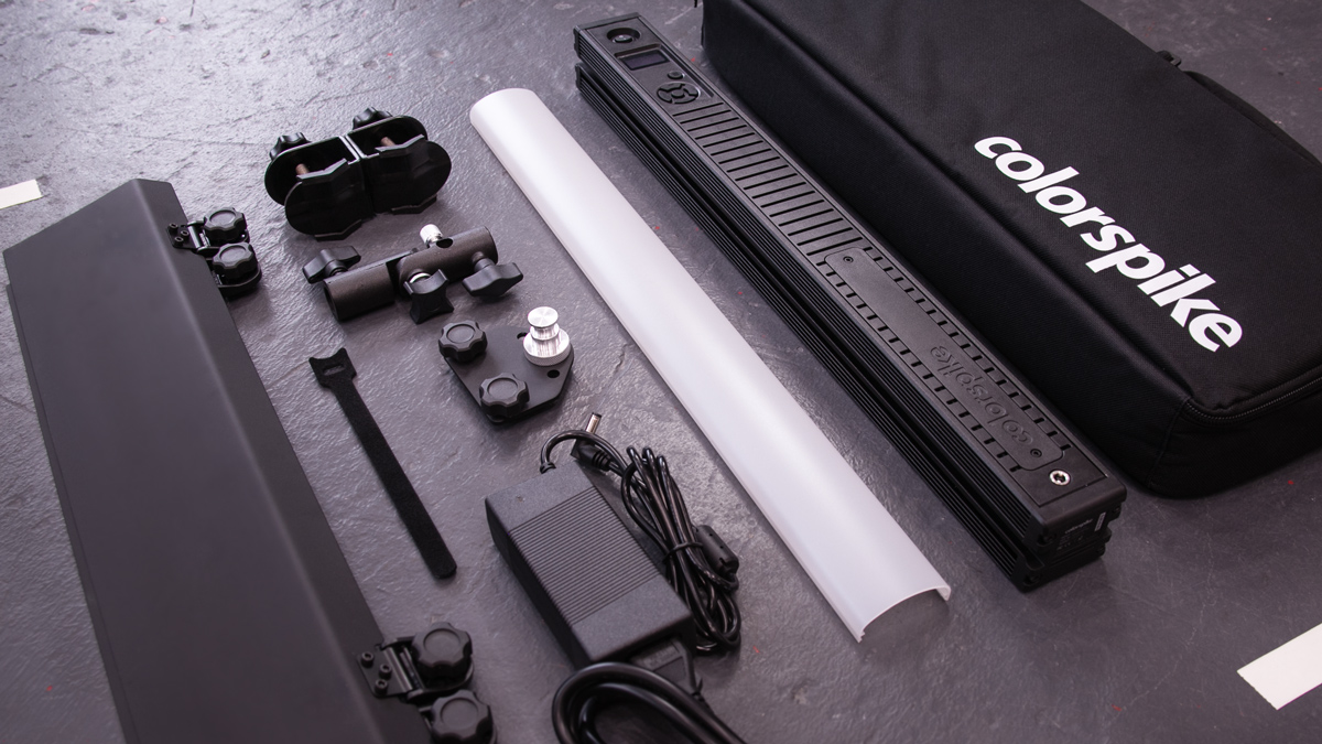 Colorspike comes in a durable padded bag and includes a power supply for your region, a mounting plate with stud, and a rounded diffuser.